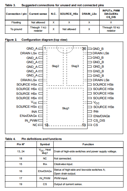 当CS_DIS针被低驱动或保持打开时,CS针允许通过提供与其值成比例的电流来监测电机电流。当CS_DIS被高驱动时,CS引脚处于高阻抗状态。PWM,高达20 KHz,允许在所有可能的条件下控制电机的速度。在所有情况下,PWM引脚上的低电平状态将同时关闭LSA和LSB开关。