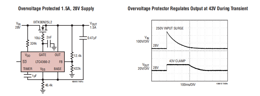 一个可调过压计时器防止MOSFET损坏,而一个额外的9秒计时器提供MOSFET冷却。停机销在停机期间将静止电流降低到14µA以下。出现故障后,LTC4366-1锁定关闭,而LTC4366-2将自动重试。