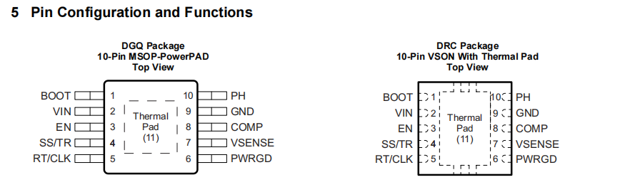 The TPS57040-Q1 is available in a 10-pin thermally enhanced MSOP PowerPAD ™ package (DGQ) and a 10-pin SON package (DRC).
