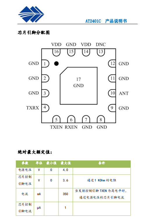 AT2401C is a fully integrated RF front-end single chip for Zigbee, wireless sensor networks and other 2.4GHz wireless systems. AT2401C is a single chip device realized by CMOS process, which integrates power amplifier (PA), low noise amplifier (LNA), chip transceiver switch control circuit, input and output matching circuit and harmonic filter circuit.