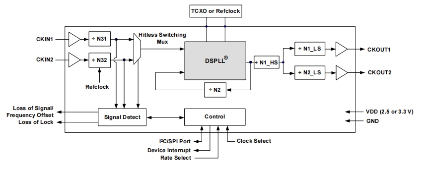 The Si5328 accepts two input clocks from 8 kHz to 710 MHz and generates two output clocks from 8 kHz to 808 MHz. The two outputs are separated from a common source. The Si5328 can also use TCXO as a clock source for frequency synthesis. The device provides almost any combination of frequency conversions within this operating range.