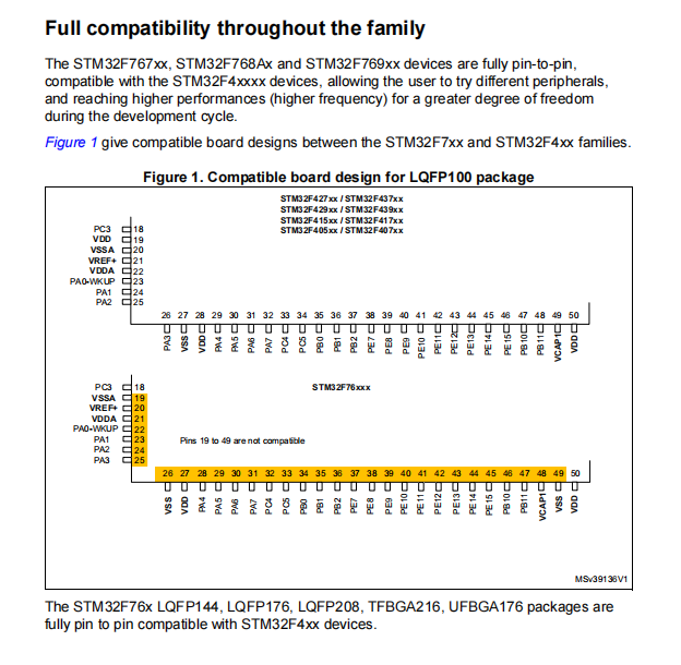 The STM32F767xx, STM32F768Ax, and STM32F769xx devices provide 10 packaged devices, from 100 to 216 pins. The set of peripherals included varies depending on the selected device.