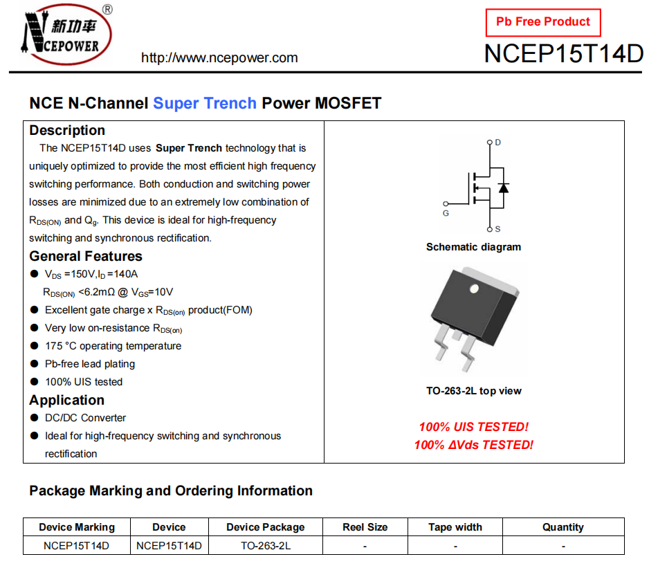 Ncep15t14d adopts super trench technology, which is uniquely optimized to provide the most efficient high-frequency switching performance. Since the combination of RDS (on) and QG is very low, both conduction and switching power losses are minimized. The device is an ideal equipment for high frequency switch and synchronous rectification.