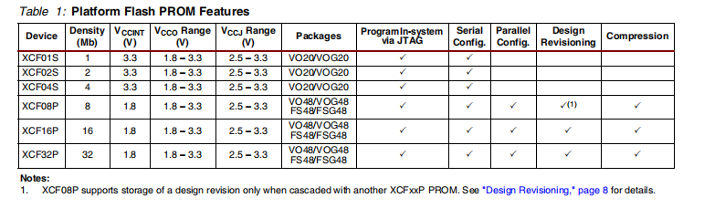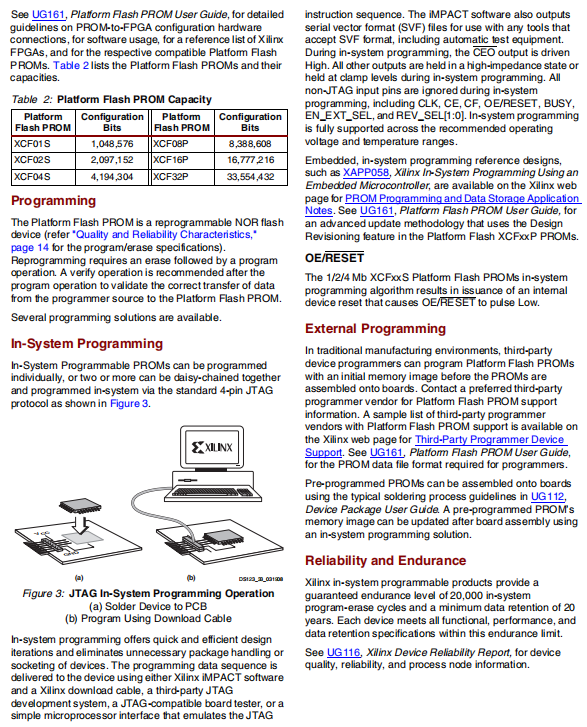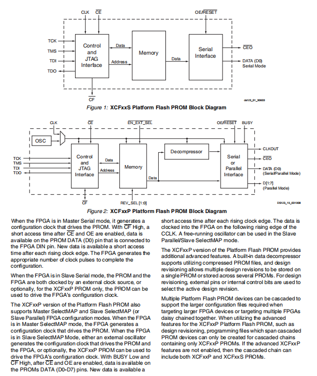 Xilinx introduces the programmable configuration prom in the system. These proms have a density of 1 to 32MB, providing an easy-to-use, cost-effective and reprogrammable method for storing large XilinxFPGA configuration bit streams. The platform flash Prom series includes 3.3vxcfxxsprom and 1.8vxcfxxpprom. The xcfxxs version includes 4MB, 2MB, and 1MB FPGAs that support the master serial and slave serial FPGA configuration modes (Figure 1, page 2). The xcfxxp version includes 32MB, 16MB and 8MB proms, which support master serial, slave serial, master select map and slave select mapfpga configuration modes (Figure 2, page 2).
