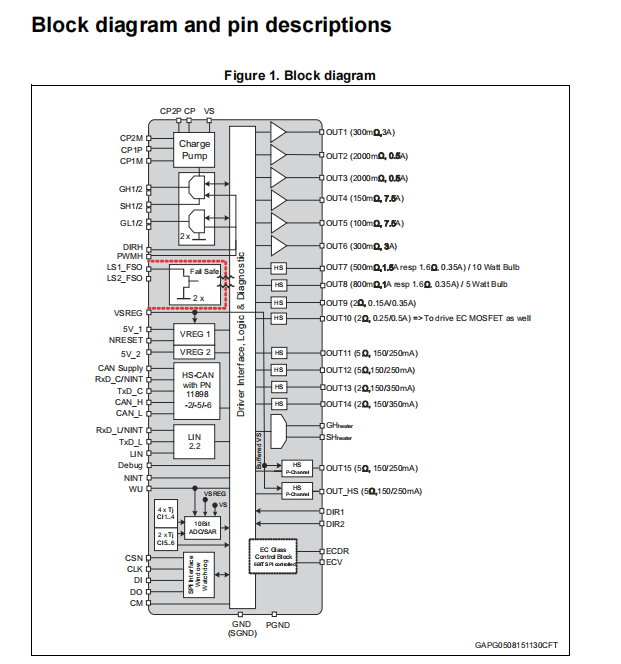 AEC Q100 compliant qualified 1 half bridge for 7.5 A load (RON = 100 mΩ) 1 half bridge for 7.5 A load (RON = 150 mΩ) 2 half bridges for 0.5 A load (RON = 2000 mΩ) 2 half bridges for 3 A load (RON = 300 mΩ) 1 configurable high-side driver for up to 1.5 A