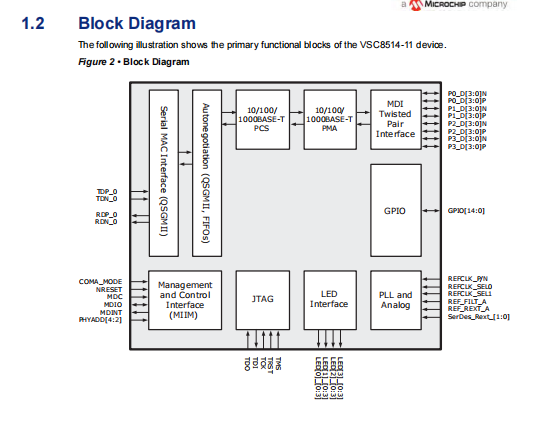 The VSC8514-11 device is a low-power Gigabit Ethernet transceiver with copper media interfaces. It has