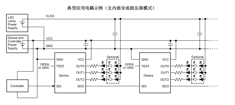 输出灌电流可由每个串联至 OUT端子的外部电阻器设定。TLC59731 内置分流稳压器,可用于更高的 VCC 电源电压 应用。