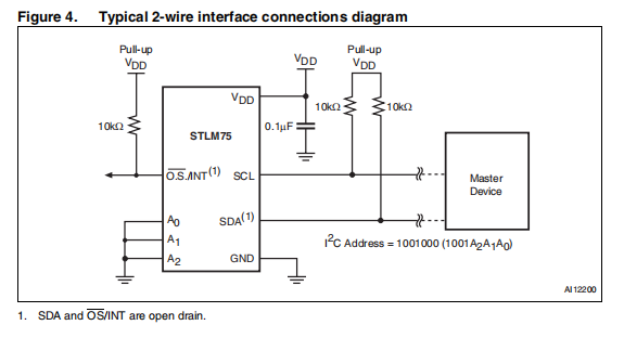 STLM75数字温度传感器是热管理和热保护应用的最佳选择。除了在SCL、SDA和OS/INT输出上的上拉电阻外,它们不需要任何外部组件来进行操作。建议在VDD上安装一个0.1µF的旁路电容器。STLM75的传感装置就是芯片本身。