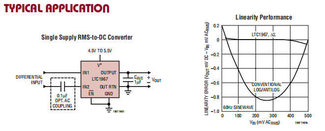 LTC1967使用单端或差分输入信号(用于EMI/RFI拒绝),并支持高达4个的波峰因子。共模输入范围为轨到轨。差分输入范围为1VPEAK,并提供了前所未有的线性度。LTC1967允许在任何输入电压下进行无麻烦的系统校准。