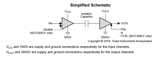 ISO7240x系列设备具有相同方向上的所有四个通道。ISO7241x系列设备具有三个相同方向的通道和一个相反方向的通道。ISO7242x系列设备在每个方向上都有两个通道。