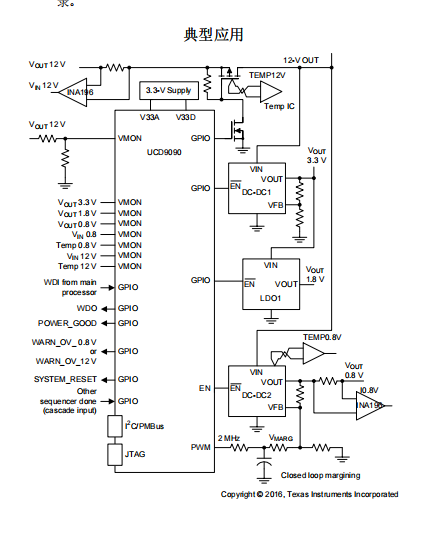 能。其中的 10 个引脚提供 PWM 功能。利用这些引脚,UCD9090 可支持裕度调节以及通用 PWM 功能。运用引脚选择电压轨状态功能可实现特定的电源状态。