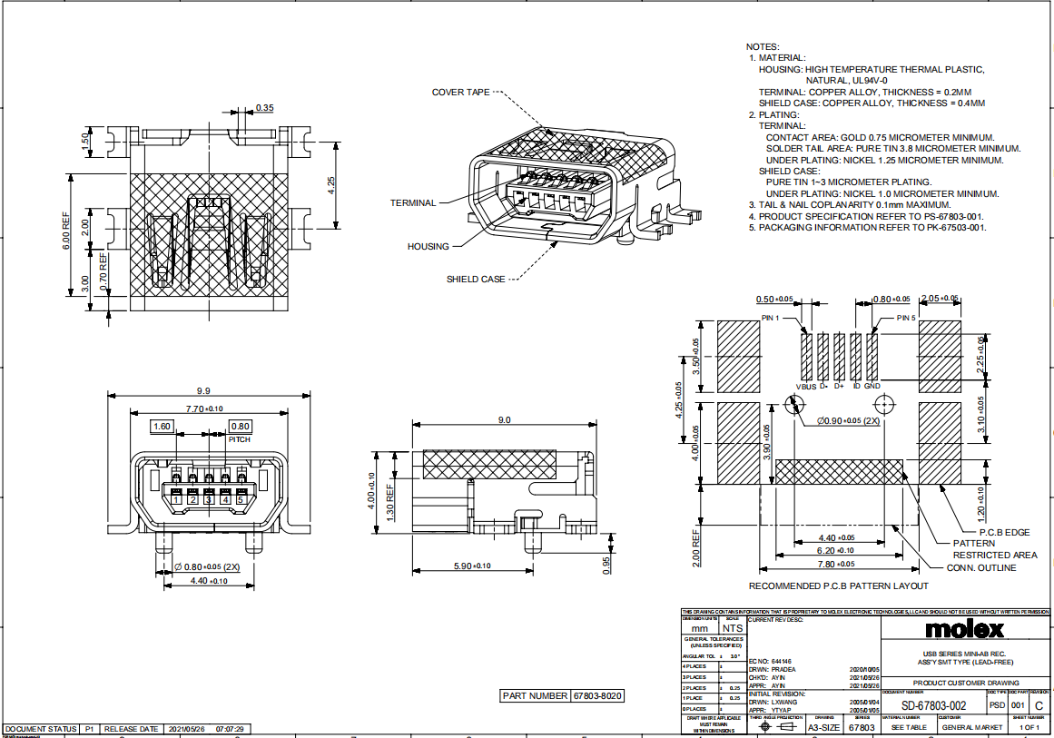 678038020 MOLEX USB连接器 原装现货技术相关 / 2022/4/27 17:14:13 678038020规格信息:排数:1触点数:5电路数:5极性:Female额定电流:1.00 A触点材质:Copper Alloy无卤素状态:Not Low Halogen方向:Right Angle触点电镀:Gold安装方式:PCB, Surface Mount, Horizontal包装方式:Reel, Cut Tape (CT)含铅标准:Lead FreeRoHS标准:Compliant 产品生命周期:Active