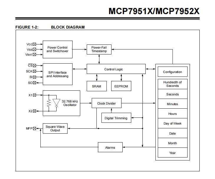 MCP795XX实时时钟/日历(RTCC)使用内部计数器跟踪小时、分钟、秒、秒、百秒、天、月、年和日。警报可以在所有计数器上配置,包括数月。对于使用和配置,MCP795XX支持高达5MHz的SPI通信。