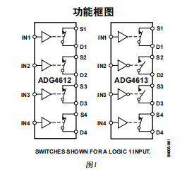 ADG4612/ADG4613内置四个独立的单刀单掷(SPST)开关。ADG4612开关的接通条件是相关的控制输入为逻辑1。ADG4613有两个开关的数字控制逻辑与ADG4612相似,但其它两个开关的控制逻辑则相反。当接通时,各开关在两个方向的导电性能相同,输入信号范围可扩展至电源电压范围。ADG4613为先开后合式开关,适合多路复用器应用。