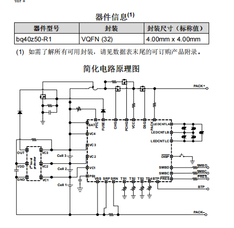 The bq40z50-R1 device uses the patented Impedance Track technology, which is a single chip fully integrated solution based on battery packs. It provides a series of rich functions such as power monitoring, protection and certification for 1, 2, 3 and 4 series lithium ion or lithium polymer battery packs.