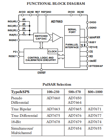 The AD7663 is a 16 bit, 250 kSPS, charge redistribution SAR, analog to digital converter that operates from a 5V power supply. It includes a high-speed 16 bit sampling ADC, a resistive input expander that allows a variety of input ranges, an internal conversion clock, error correction circuits, and serial and parallel system interface ports.
