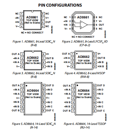 The single AD8661 has a narrow 8-lead SOIC package and a very thin dual lead 8-lead LFCSP. AD8661 SOIC_ The N package is specified at − 40 ° C to+125 ° C AD8661 LFCSP_ VD is specified in the industrial temperature range of − 40 ° C to+85 ° C The AD8662 has a narrow 8-lead SOIC package and an 8-lead MSOP, both designated ° C within the extended industrial temperature range of − 40 ° C to+125 The AD8664 has a narrow 14 lead SOIC package and a 14 lead TSSOP, both of which have an industrial temperature range of − 40 ° C to+125 ° C